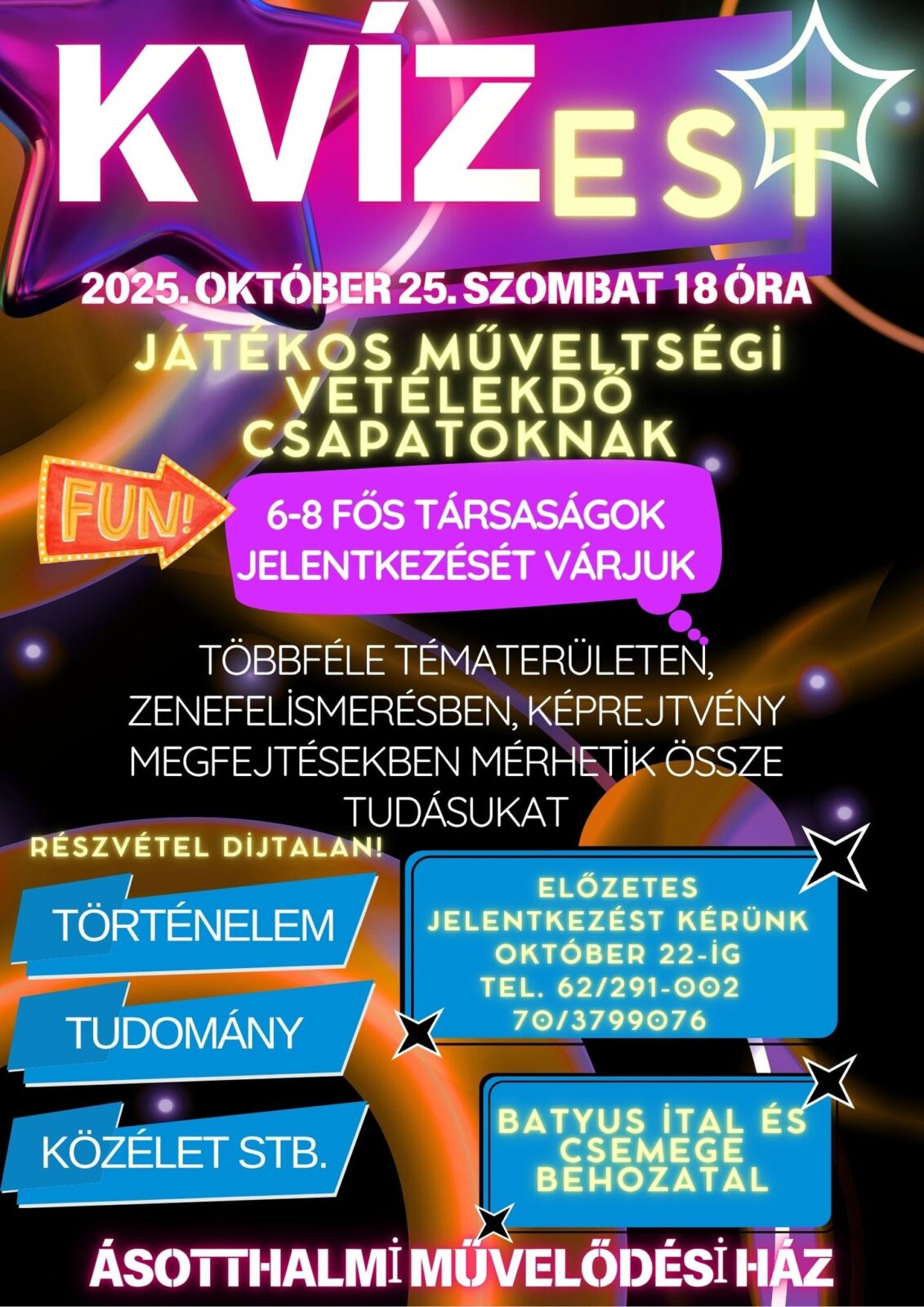 Kvízest – Művelődési Ház – 2025. október 25. szombat 18 óra