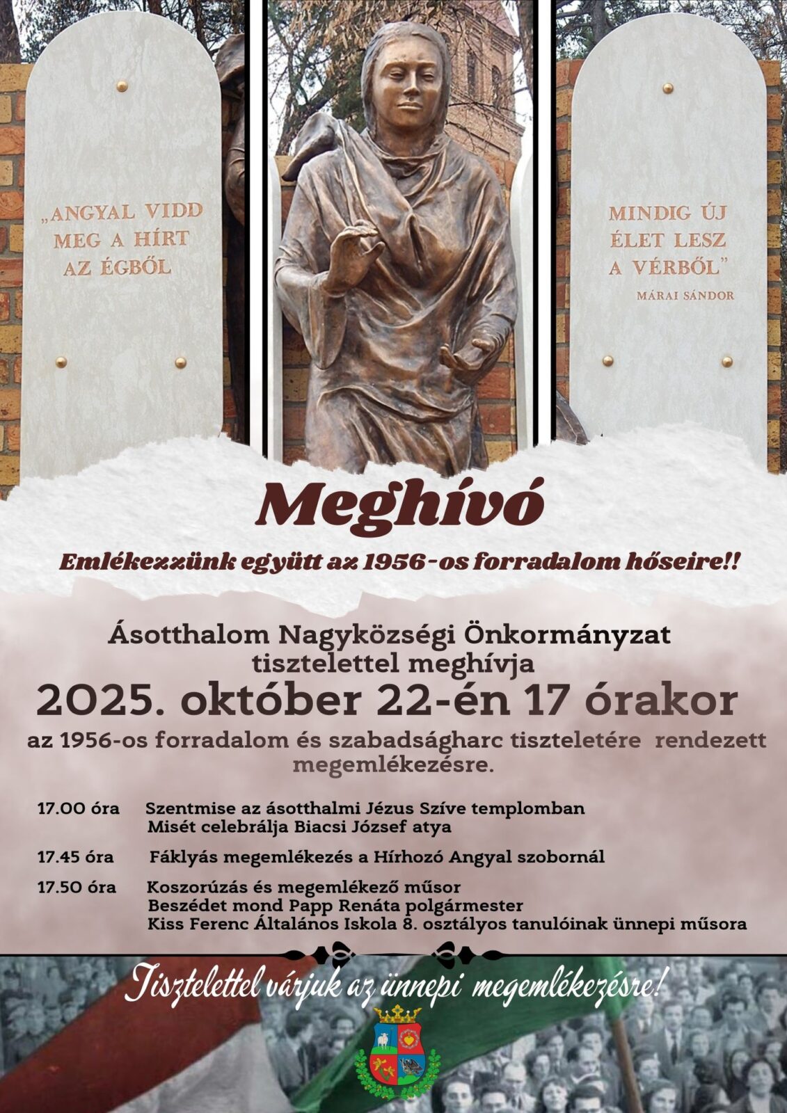 Ásotthalom Nagyközségi Önkormányzat tisztelettel meghívja nemzeti ünnepi megemlékezésére 2025. október 22-én 17 órai kezdettel.