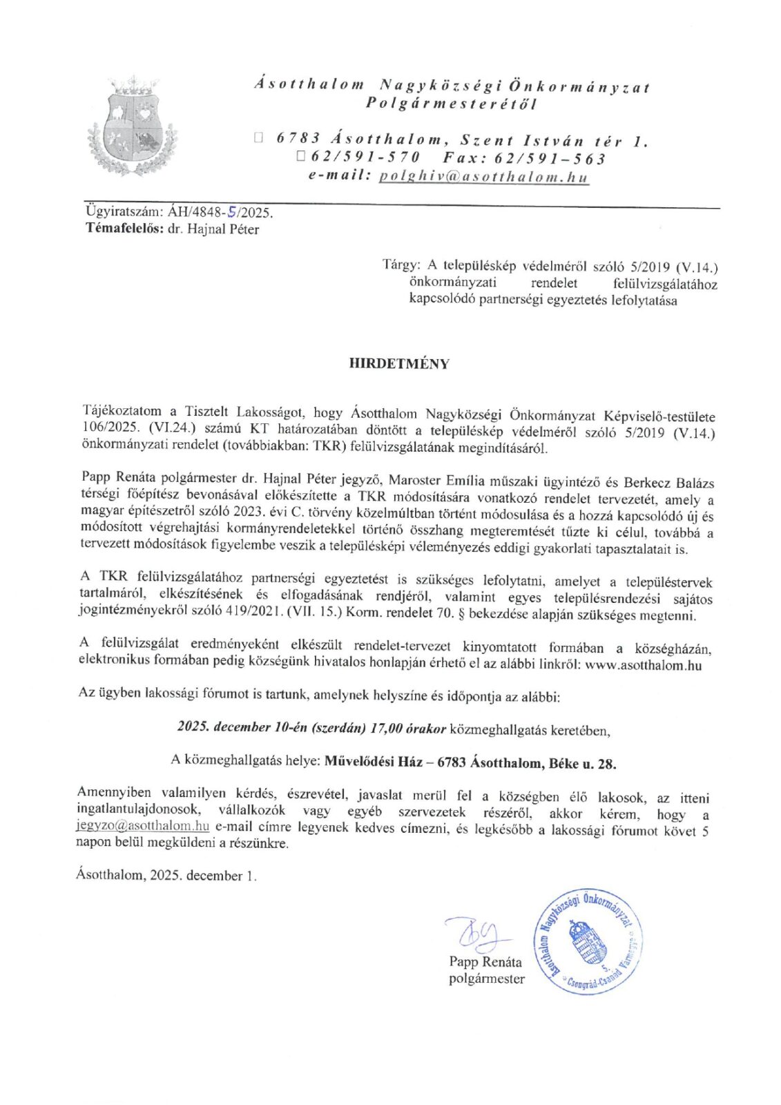 Hirdetmény – A településkép védelméről szóló 5/2019 (V.14.) önkormányzati rendelet felülvizsgálatához kapcsolódó partnerségi egyeztetés lefolytatása